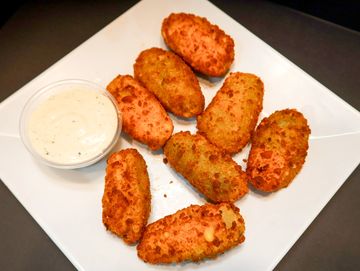 BREADED & DEEP FRIED MACARONI & CHEESE STICKS SERVED WITH THAI CHILI SAUCE