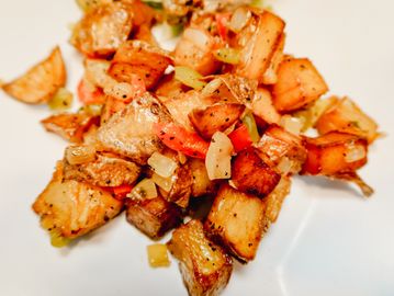 GRILLED CHICKEN TOSSED IN A HONEY GARLIC GLAZE WITH GRILLED ONIONS & BELL PEPPERS OVER WHITE RICE
