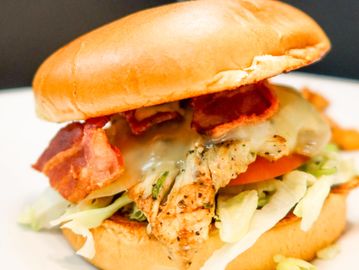 NEW ON THE MENU- GRILLED CHICKEN BREAST LAYERED WITH CRISPY BACON, MELTED CHEDDAR AND PEPPER JACK CHEESE, LETTUCE, TOMATO & RANCH ON A BRIOCHE BUN