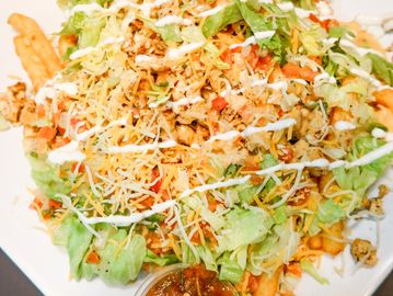 FRIES TOPPED WITH CHOICE OF MEAT, QUESO, PICO, LETTUCE, SOUR CREAM SERVED WITH SALSA