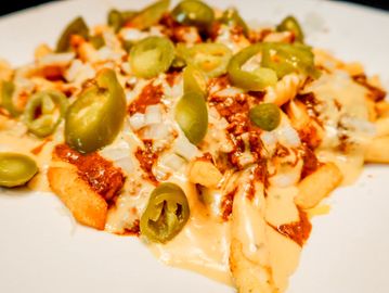 FRIES TOPPED WITH HOUSE BEEF CHILI, QUESO, ONIONS & JALAPEÑOS