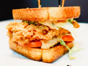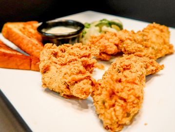 CRISPY CHICKEN STRIPS TOSSED IN BUFFALO SAUCE, MELTED SWISS ON BUTTERY TEXAS TOAST
