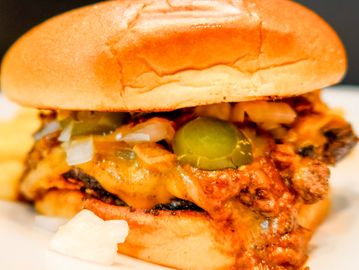 QUITE THE MESS- ANGUS BEEF PATTY SMOTHERED IN HOUSE BEEF CHILI, MELTED CHEDDAR CHEESE, DICED ONIONS, CRISPY CORN CHIPS & JALAPEÑOS SERVED ON A BRIOCHE BUN