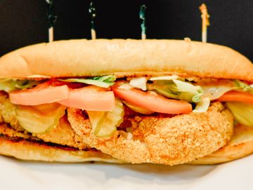 CRISPY FRIED CATFISH WITH LETTUCE, TOMATO, PICKLES & REMOULADE ON A TOASTED HOAGIE ROLL