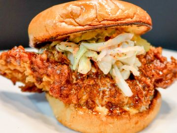NASHVILLE-STYLE CRISPY FRIED CHICKEN TOPPED WITH COLESLAW, PICKLES & CHIPOTLE MAYO ON A BRIOCHE BUN
