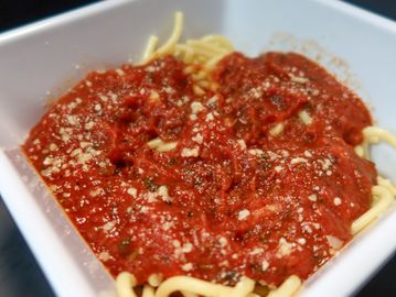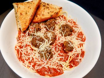 CLASSIC RED SAUCE SPAGHETTI & BEEF MEATBALLS SERVED WITH GARLIC TOAST