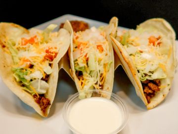 SEASONED BEEF, LETTUCE, TOMATO, ONIONS, CHEESE ON GRILLED FLOUR TORTILLAS SERVED WITH SOUR CREAM & SALSA