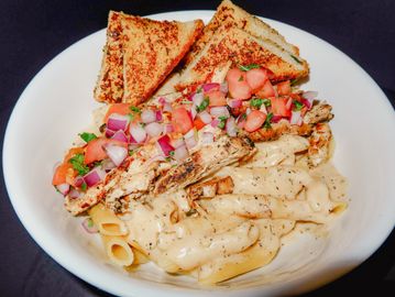 PENNE PASTA TOSSED IN CREAMERY ALFREDO WITH GRILLED CHICKEN, TOMATO, ONIONS, SHAVED PARMESAN SERVED WITH GARLIC TOAST