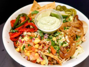 FRIED CHIPS TOPPED WITH LETTUCE, GRILLED CHICKEN, CORN SALSA, JALAPEÑOS, GRILLED ONIONS & BELL PEPPERS, CHEESE, CILANTRO SERVED WITH AVOCADO LIME RANCH