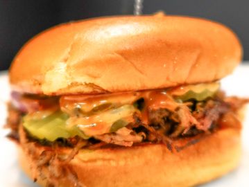 SLOW-SMOKED BRISKET WITH ONIONS, PICKLES & BBQ SAUCE ON A BRIOCHE BUN