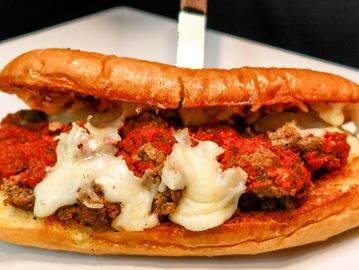 JUICY BEEF MEATBALLS, MOZZARELLA CHEESE & HOUSE MARINARA ON A TOASTED HOAGIE ROLL