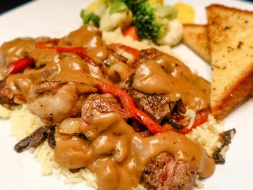 TENDER BEEF TIPS SIMMERED IN BROWN GRAVY WITH GRILLED ONIONS, MUSHROOMS, BELL PEPPERS SERVED OVER WHITE RICE