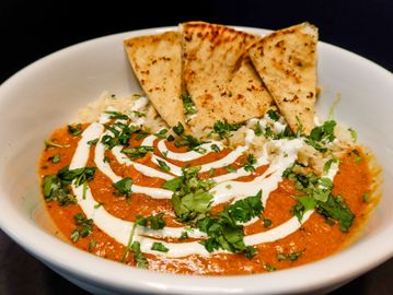 TENDER CHICKEN SIMMERED IN CREAMERY SPICED TOMATO BUTTER SAUCE SERVED OVER BASMATI RICE WITH BUTTER NAAN