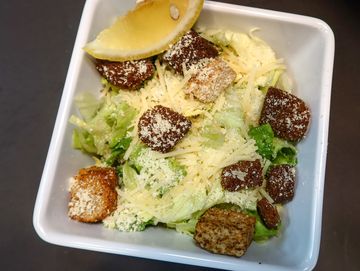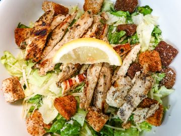 SEASONED GRILLED CHICKEN, SHAVED PARMESAN, CRISPY CROUTONS & SALAD MIX SERVED WITH CAESAR DRESSING & LEMON