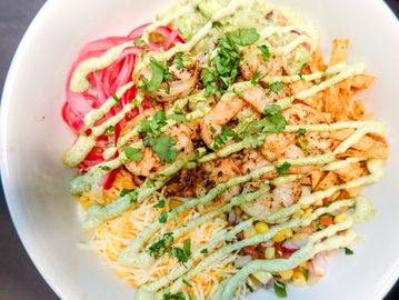 GRILLED CHICKEN OVER RICE WITH PICKLED ONIONS, CORN SALSA, TORTILLA STRIPS, CHEESE, GUACAMOLE & AVOCADO LIME RANCH