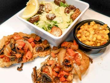 FRIED OR GRILLED CHICKEN SERVED WITH TOMATOES, ONIONS & GRILLED MUSHROOMS