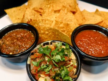 FRESHLY FRIED CHIPS SERVED WITH TOMATO OR TOMATILLO SALSA & CHEESY BRISKET QUESO
