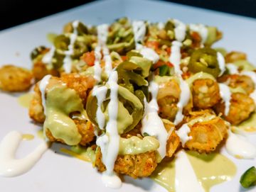 TOTS WITH CHEESE, PICO, JALAPEÑOS, SOUR CREAM & GREEN SAUCE
