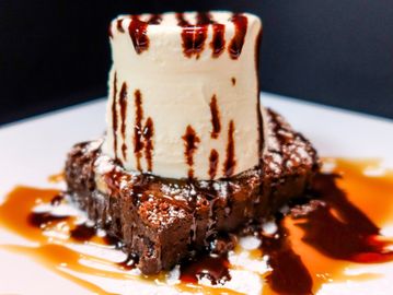 FUDGE BROWNIE, DUSTED POWDER SUGAR, CARAMEL SAUCE, ICE CREAM