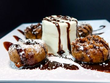 DOUBLE STUFFED OREOS, DUSTED POWDER SUGAR, CHOCOLATE SAUCE, ICE CREAM