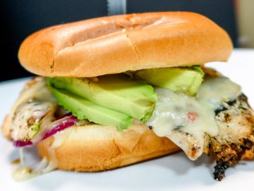 GRILLED CHICKEN, AVOCADO, PEPPER JACK CHEESE, RED ONIONS, CILANTRO & CHIPOTLE MAYO ON A BRIOCHE BUN